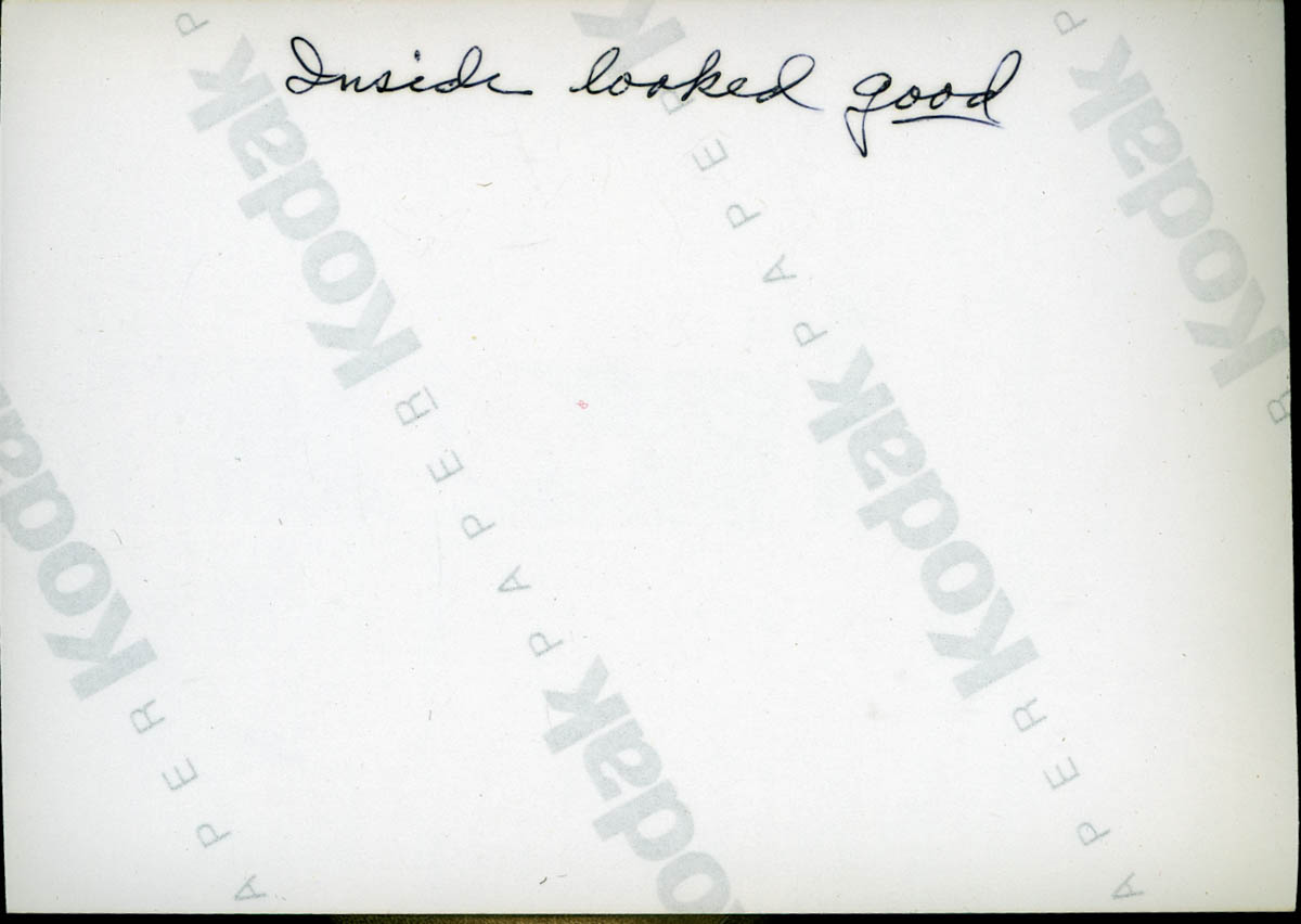 - Snapshot of a woman standing in the doorway of a church. Handwritten label on back says "Inside looked good"