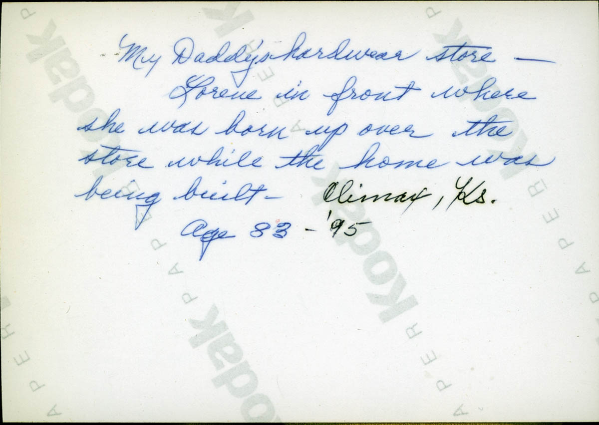 - Snapshot of a woman standing in front of a building. Handwritten label on back says "My daddy's hardward store - Lorene in front where she was born up over the store while the home was being built - Climax, Ks. Age 83 - '95"