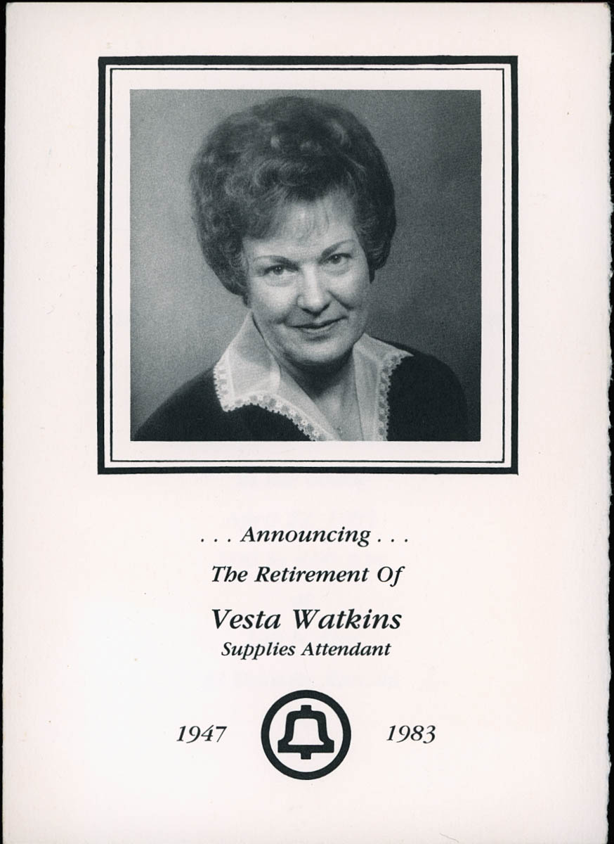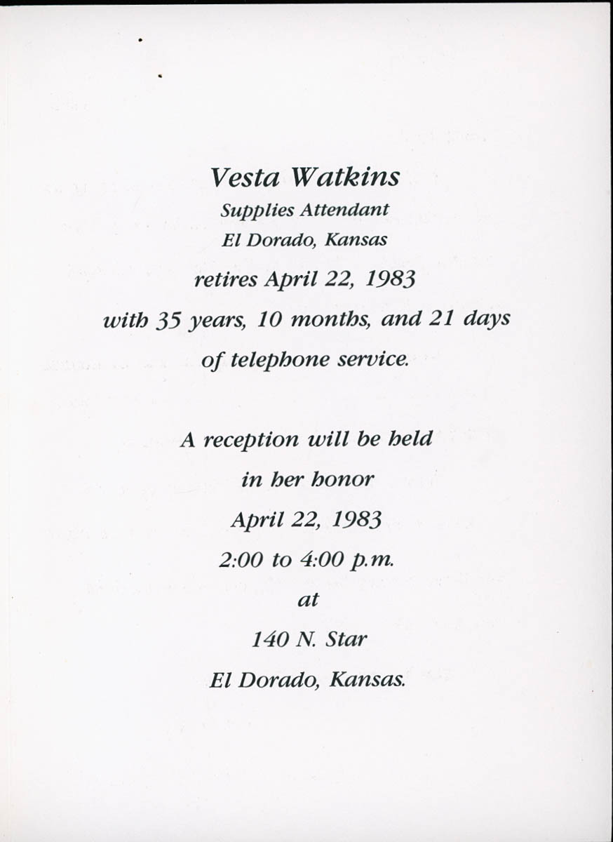 Unknown Authors, “Invitation to Retirement Party for Vesta Watkins,” MHGS Digital Collections, accessed April 17, 2026, https://mhgswichita.org/om/items/show/12018.