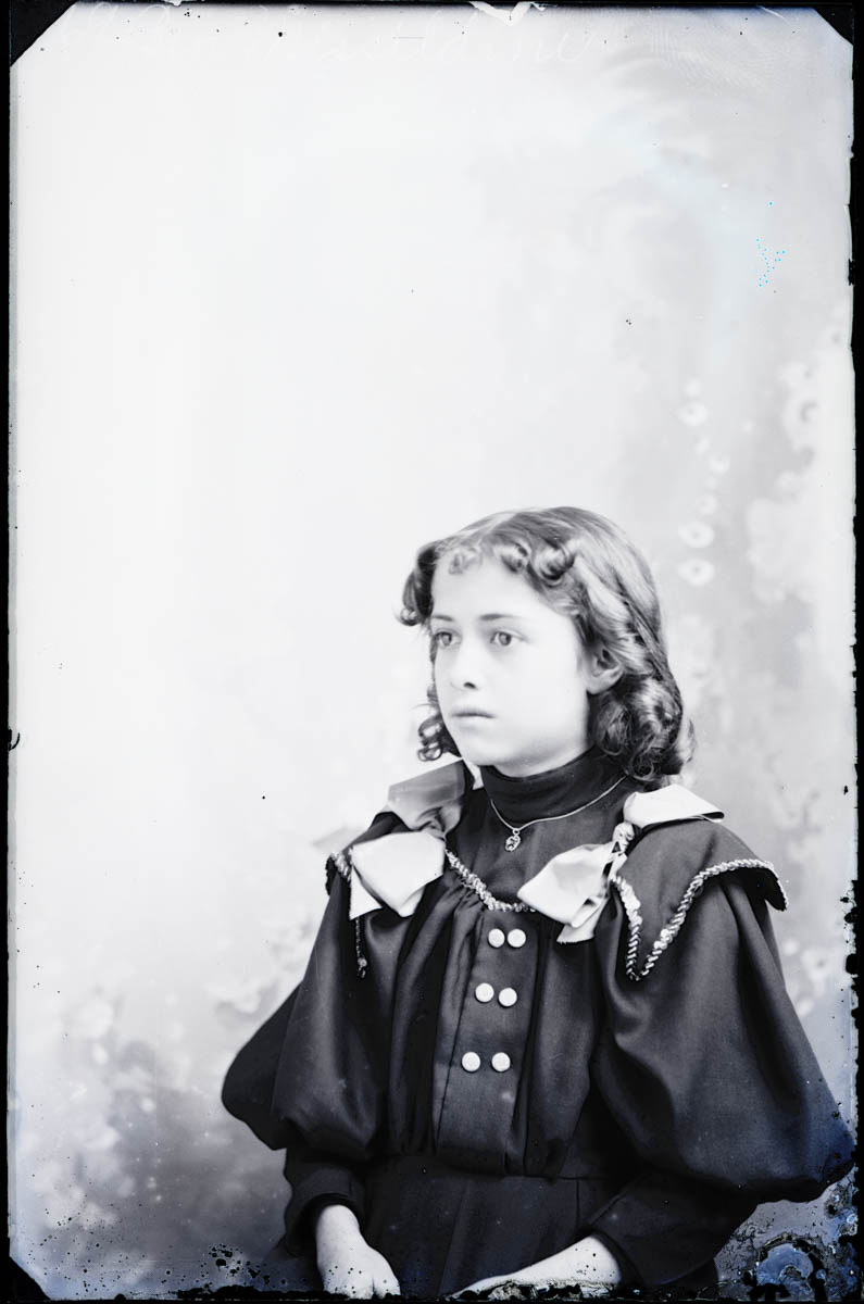 - Studio portrait of a young woman. Handwritten label on plate says "69 Ben Missildine" Found in Box L, labeled "Oxford." Because of our scanning procedure, this image is most likely flipped horizontally.