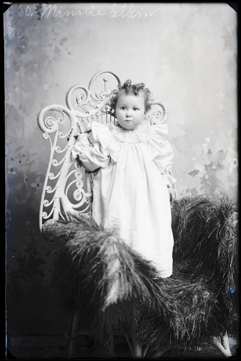 - Studio portrait of a baby. Handwritten label on plate says "60 Minnie Elkin" Found in Box L, labeled "Oxford." Because of our scanning procedure, this image is most likely flipped horizontally.