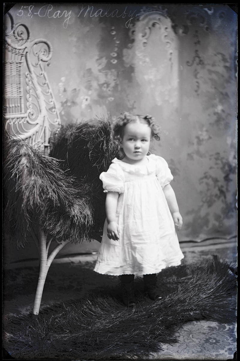 - Studio portrait of a little girl. Handwritten label on plate says "58 Ray Malaby" Found in Box L, labeled "Oxford." Because of our scanning procedure, this image is most likely flipped horizontally.