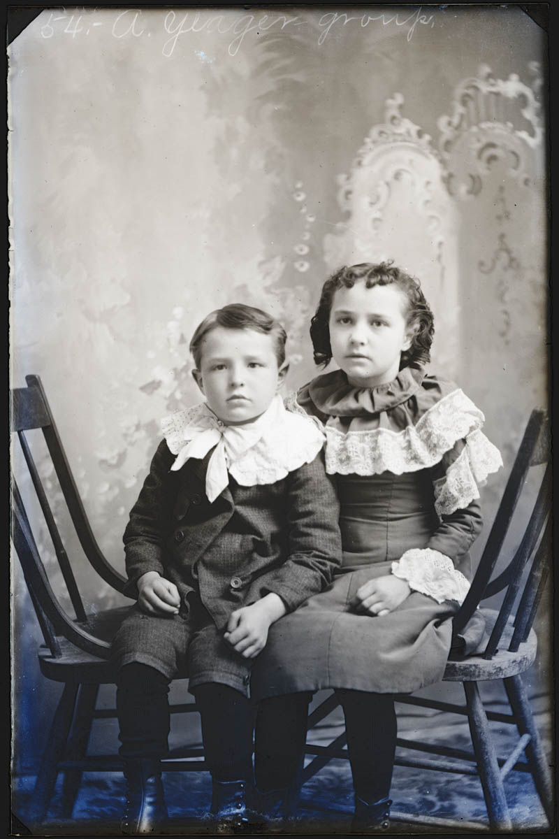 - Studio portrait of two children. Handwritten label on plate says "54 A. Yeager - group" Found in Box L, labeled "Oxford." Because of our scanning procedure, this image is most likely flipped horizontally.