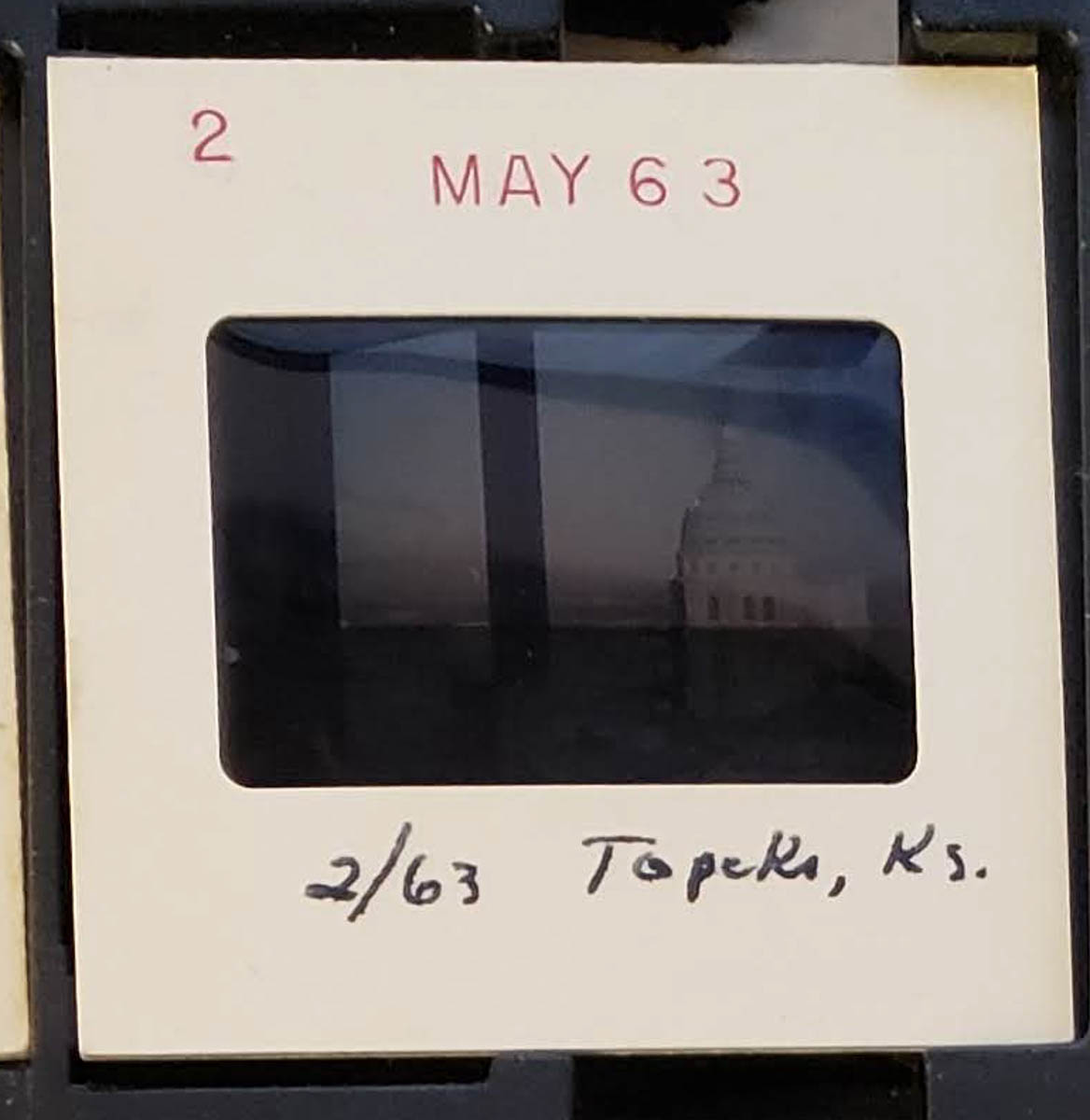 - Snapshot of woman looking out a window at the Kansas capitol builidng. Handwritten label on slide frame says "2/63 Topeka, Ks."