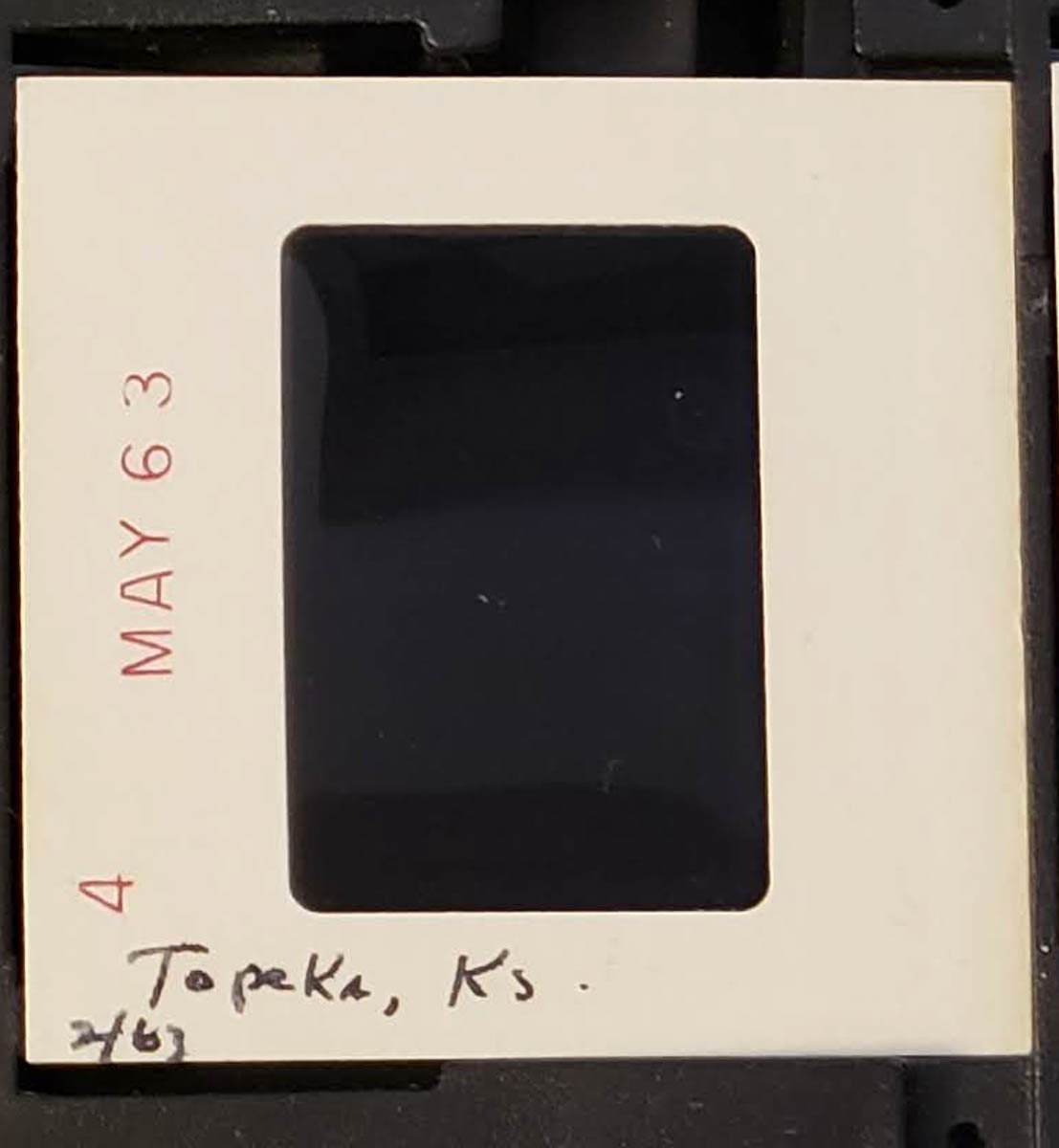 - Snapshot of a man standing in front of an office building. Handwritten label on slide frame says "2/63 Topeka, Ks."