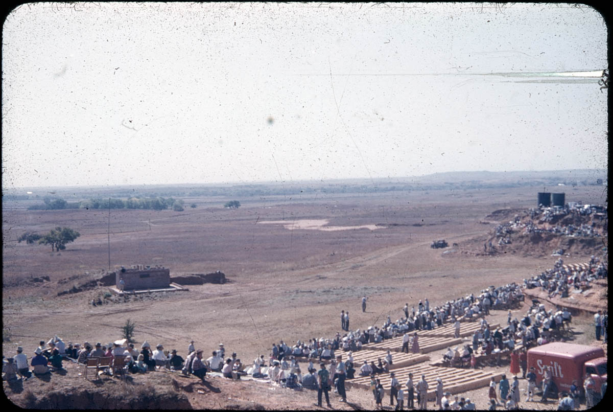 - Snapshot of people gathering at an outdoor amphitheater. Handwritten index entries say "Peace Treaty Pageant, Medicine Lodge, 1952" and "No. 23 - Pageant Grounds, Medicine Lodge Ks - Oct. 1952"