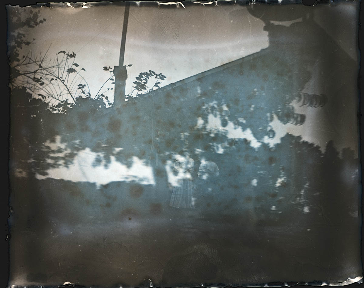 - Double exposure print of a house and some foliage.