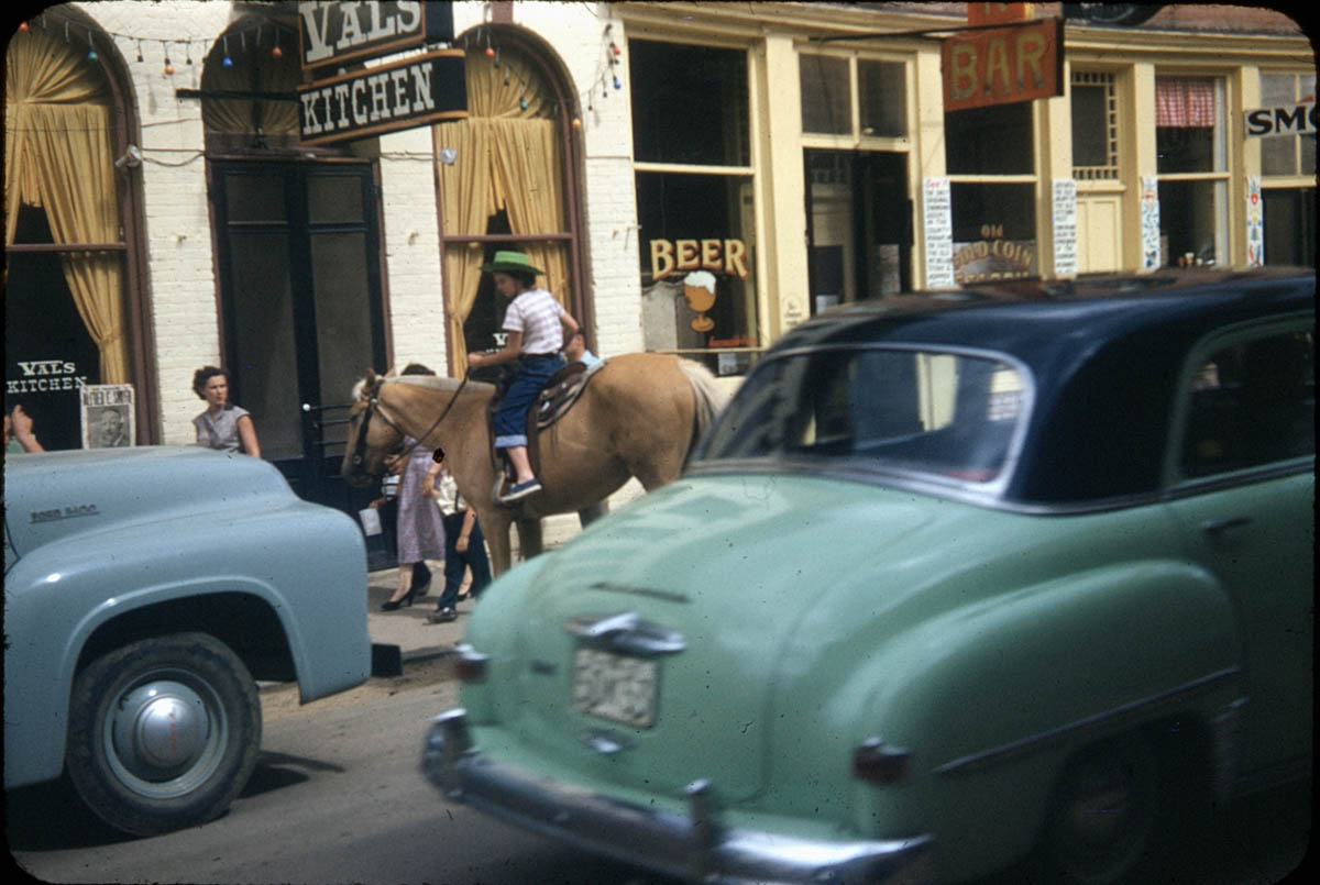 - Snapshot of a girl on a horse in the historic district of a mountain town. Handwritten index entry says "No. 209 - Central City, Colo., July 1954"