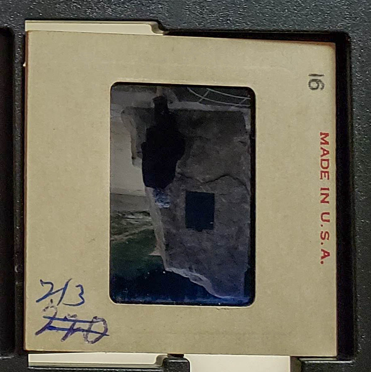 - Snapshot of a woman standing by a rock with an historical marker. Handwritten index entry says "No. 213 - Lorene at Berthoud Summit, Colo - July 1954"
