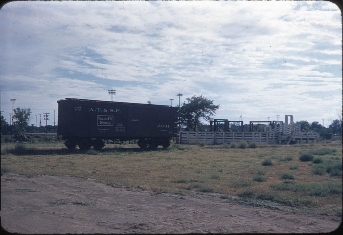 - Snapshot of a old railroad car. Handwritten index entry says "No. 454 Cowtown Wichita Street - ATSF Box Car - Sept 1956"