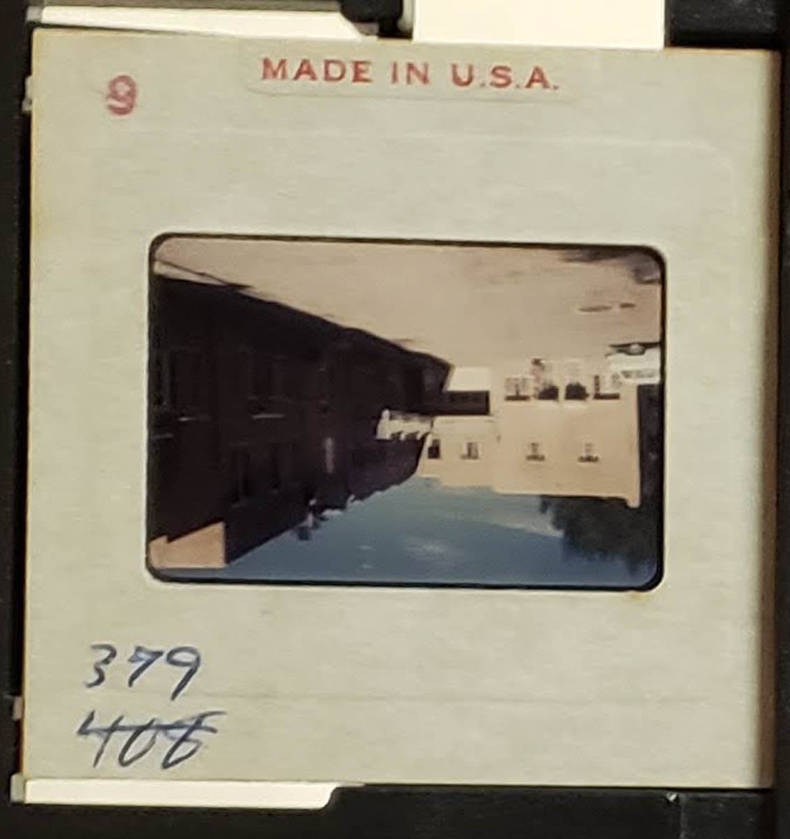 - Snapshot of a hotel building. Handwritten index entry says "No. 379 - Motel Taos - New Mexico - July 1956"