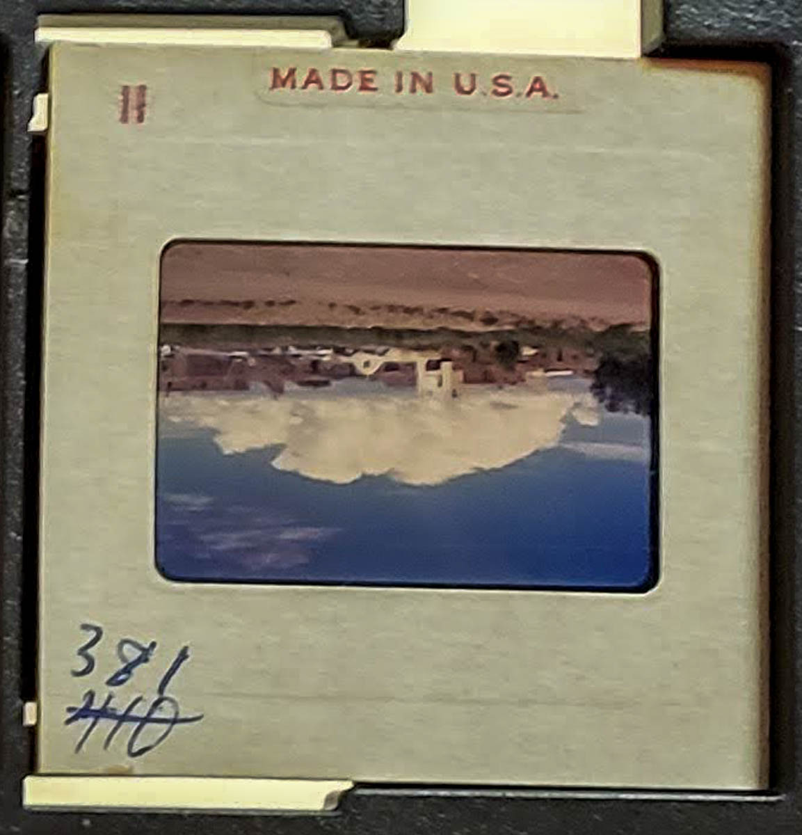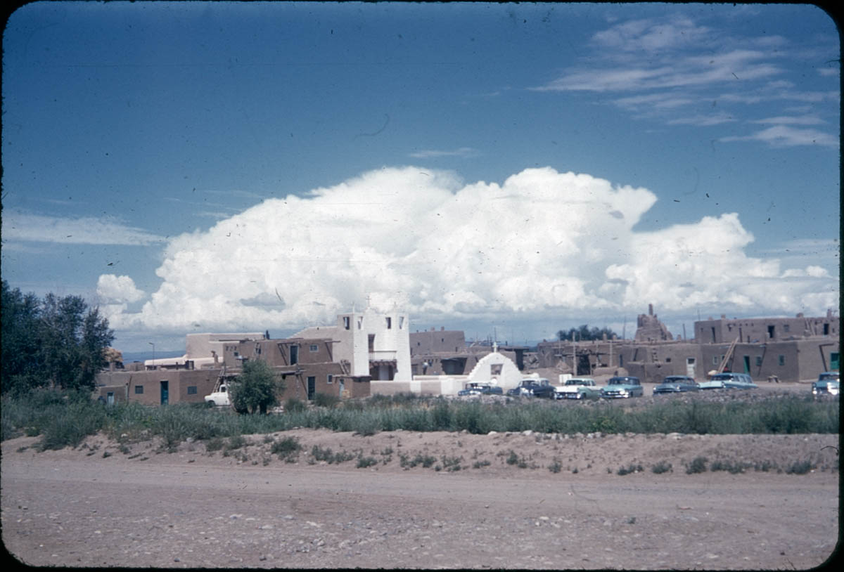 - Snapshot of a Native American pueblo complex. Handwritten index entry says "No. 381 - Taos Pueblo N.M. (Church & Gov. Res.) - July 1956"