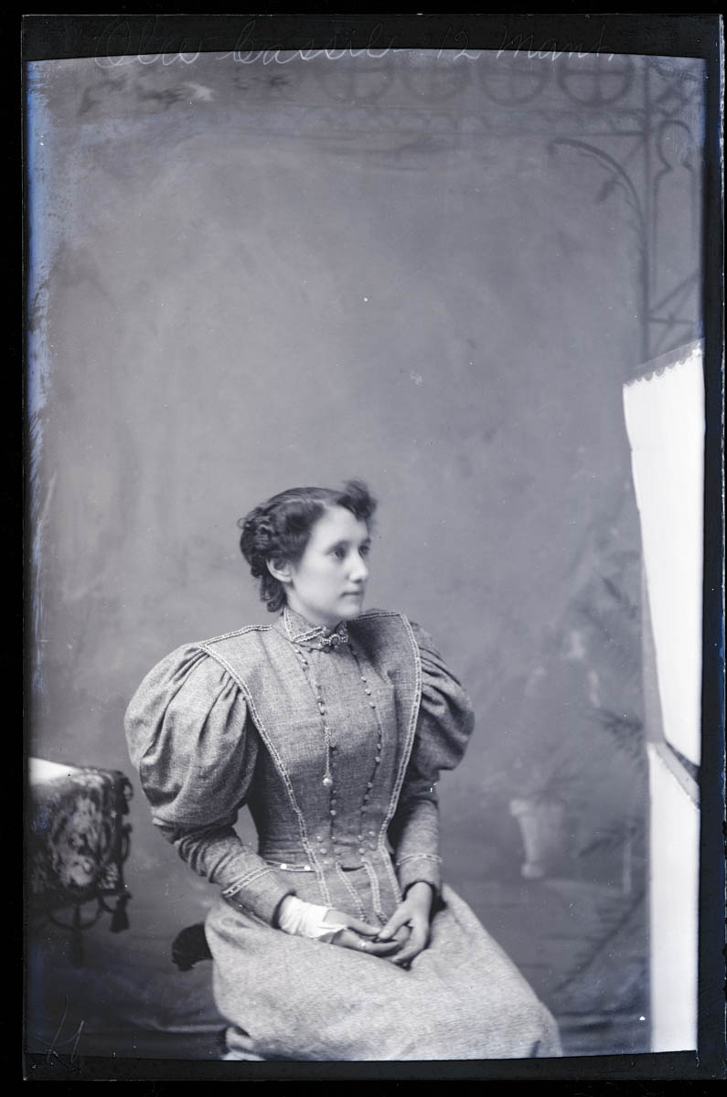 - Studio portrait of a woman. Handwritten label on plate says "Ola Cassil 12 Mant (?)" Found in Box M. Because of our scanning procedure, this image is most likely flipped horizontally.