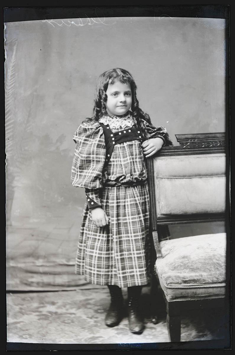 - Studio portrait of a girl. Handwritten label on plate says "Russel (12?)" Found in Box M. Because of our scanning procedure, this image is most likely flipped horizontally.