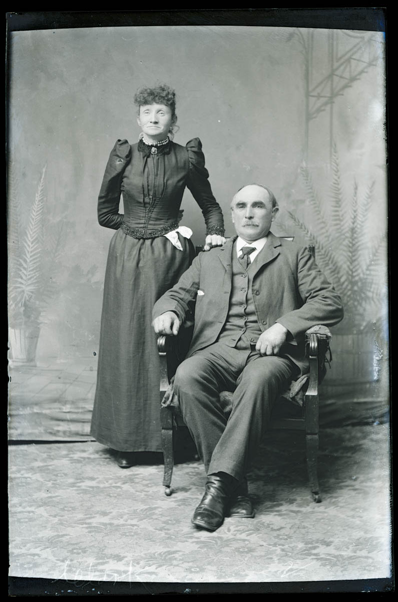 - Studio portrait of a man and a woman. Handwritten label on plate says "Clark 12." Found in Box M. Because of our scanning procedure, this image is most likely flipped horizontally.
