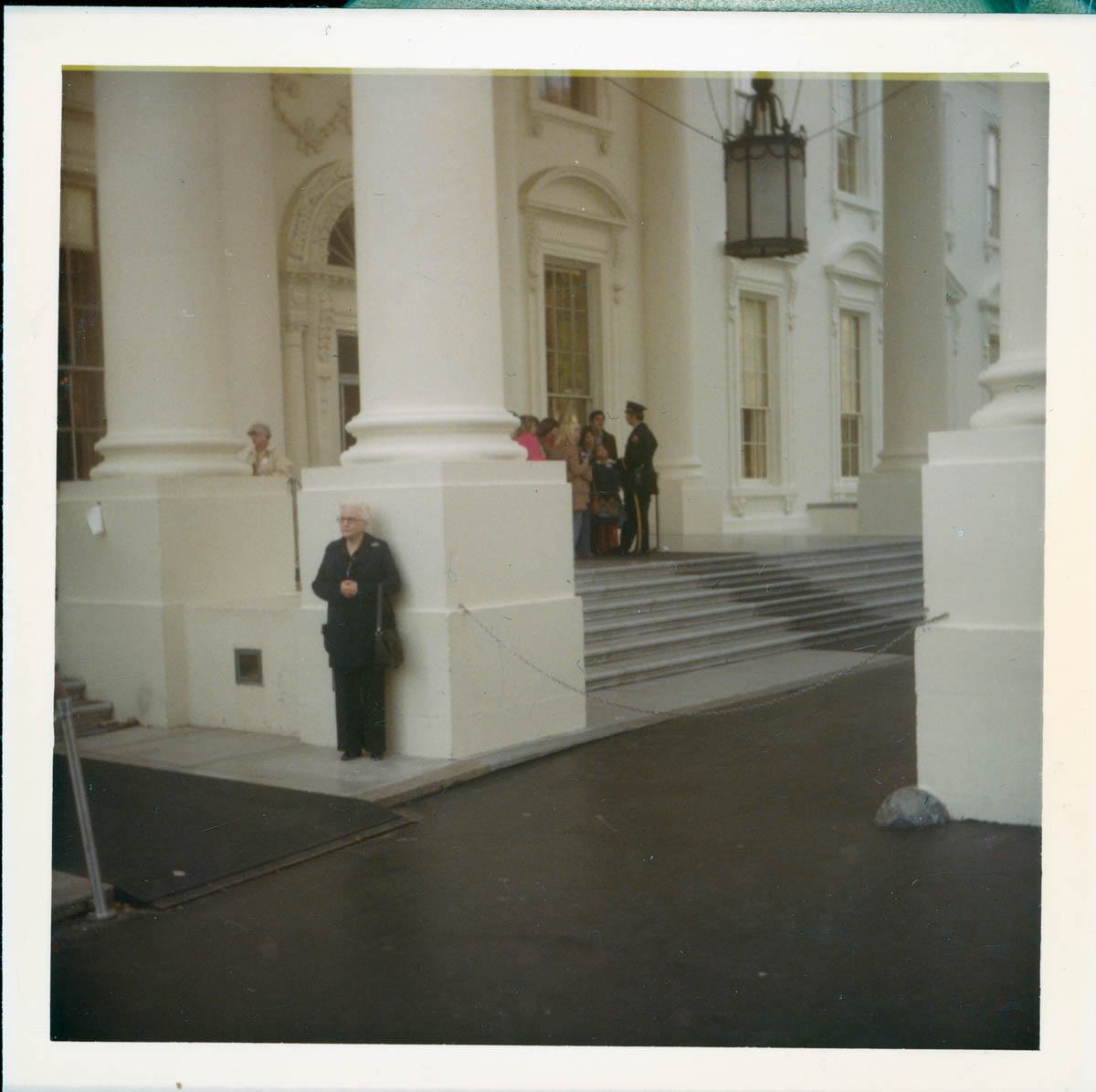 - Snapshot of a woman outside the White House. Handwritten label on back says "White House - Lorene - North Porch Washington DC"