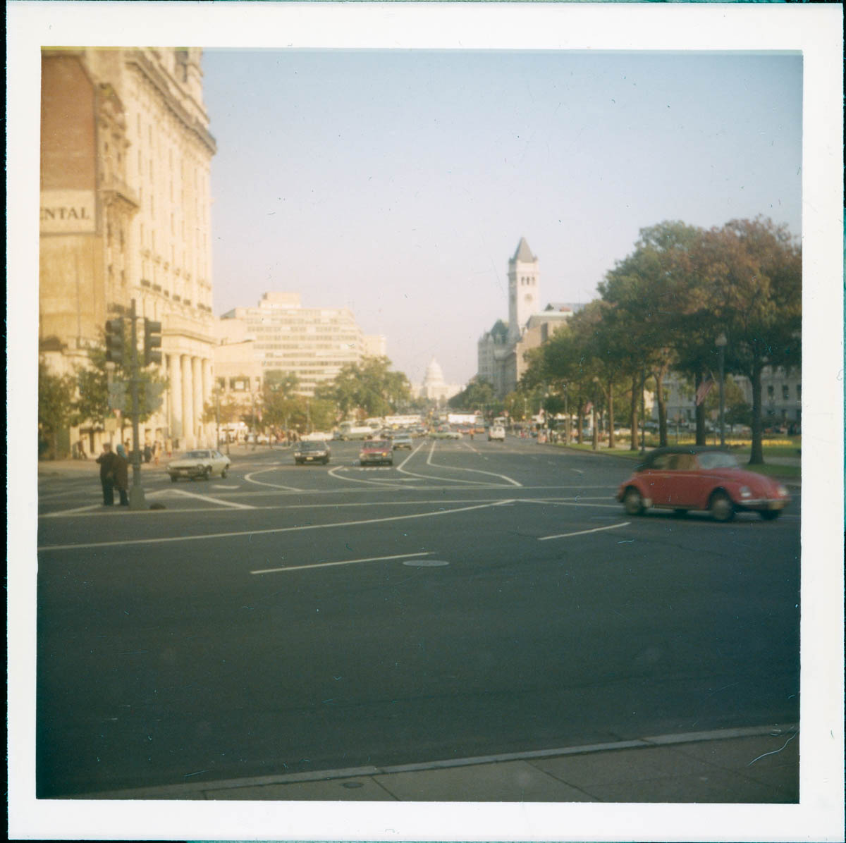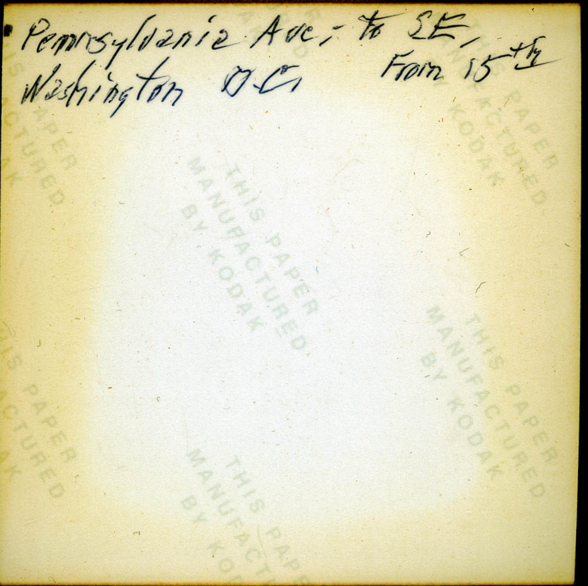 - Snapshot of a city street. Handwritten label on back says "Pennsylvania Ave. to SE from 15th Washington DC"