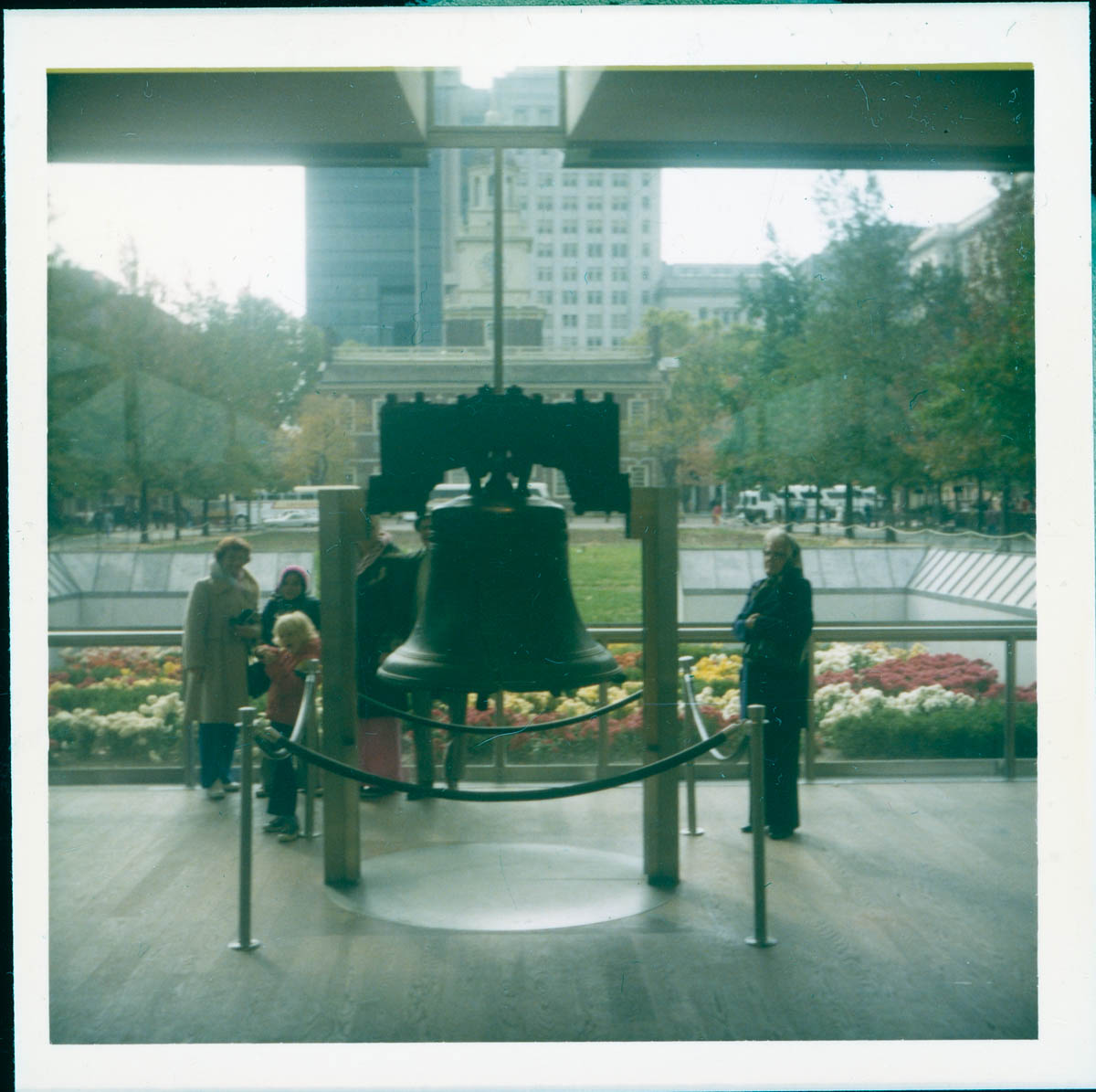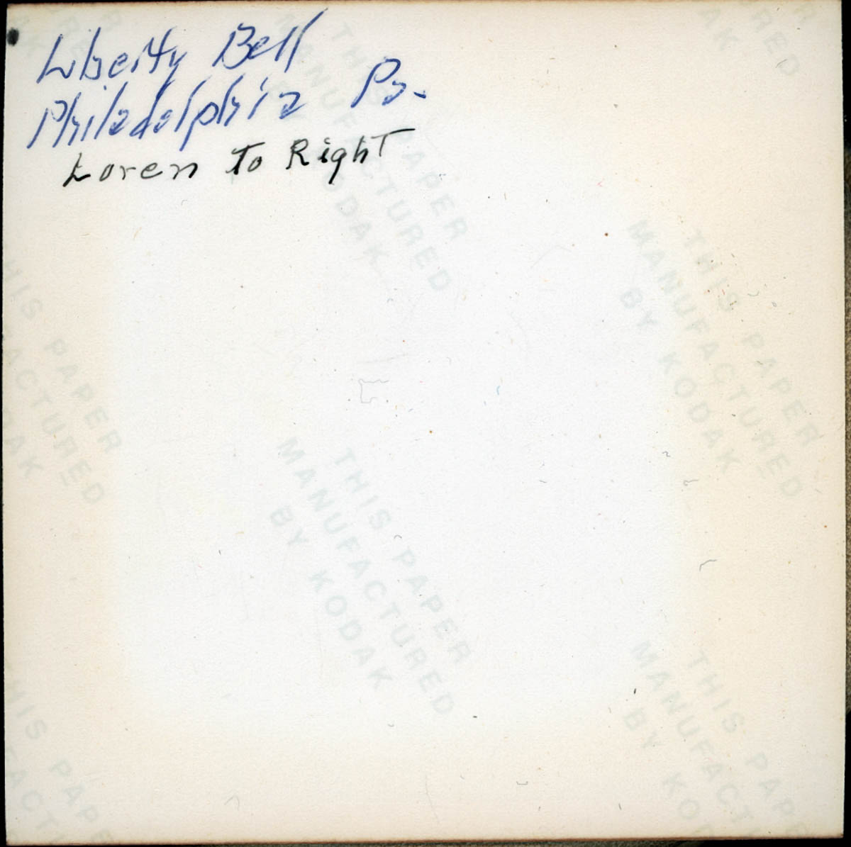 - Snapshot of a woman standing by an historic church bell. Handwritten label on back says "Liberty Bell Philadelphia Pa. Loren[sic] to right"