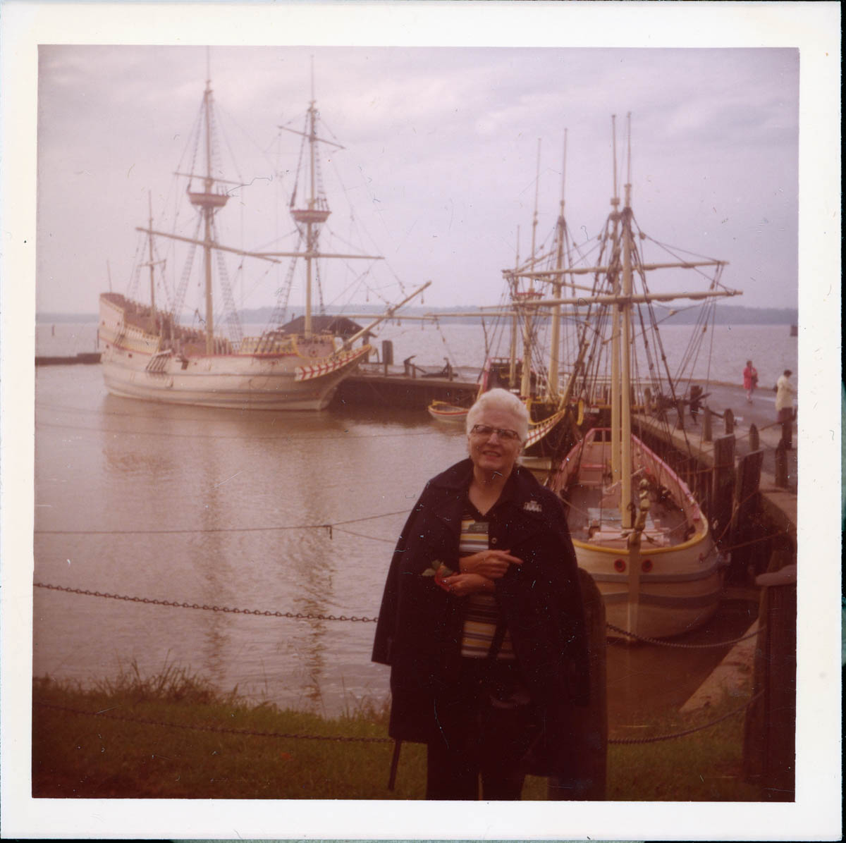 - Snapshot of a woman standing by a dock with sailing ships. Handwritten label on back says "Jamestown Va Lorene"