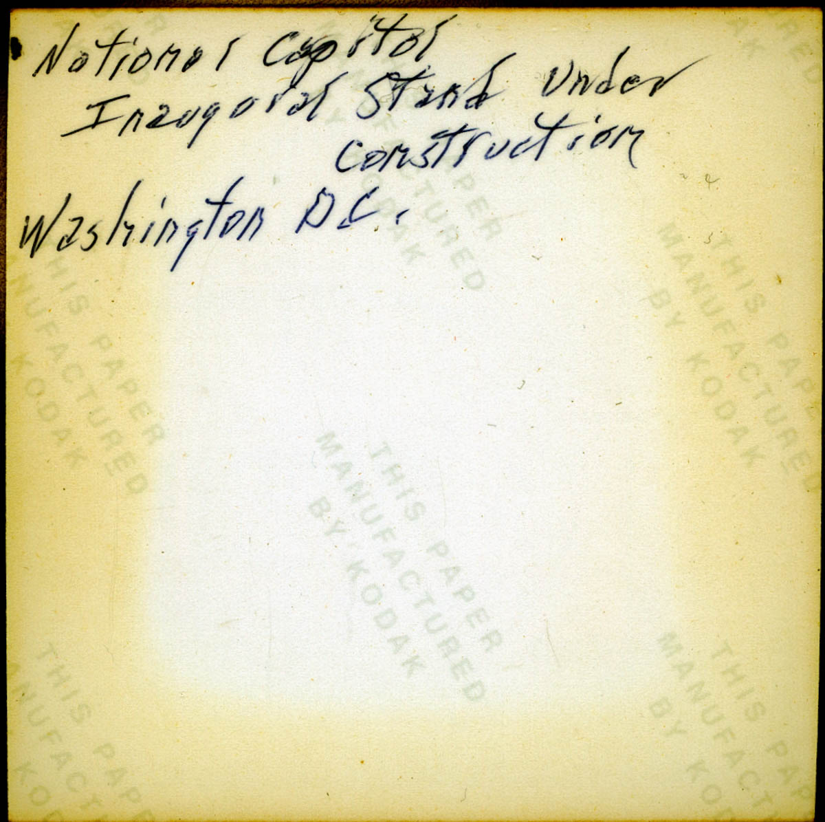 - Snapshot of the US Capitol building with scaffolding. Handwritten label on back says "National Capitol Inaugural stand under construction Washington DC"