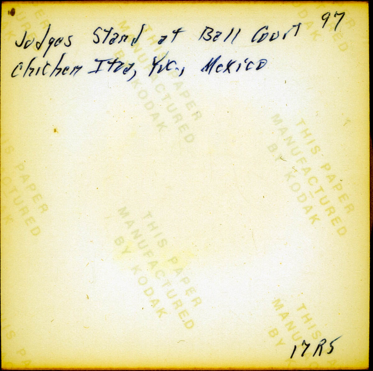 - Snapshot of a large stone structure. Handwritten label on back says "Judges Stand at Ball Court, Chichen Itza, Yuc., Mexico"