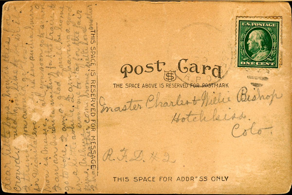 Handwritten note on back says "Dear little boys, how is this for a crowd. Would you like to be in it? I think you would get lost. In Wichita everybody is in such a hurry. How is music. Will you soon go to school. I am in Wichita waiting for the train to go to Hope. I am so glad I will go home in a little while. I am having a good time. Arthurs want me to stay for the fair I had rather come home. With love, Mother. Master Charles & Willie Bishop, Hotchkiss, Colo. R.F.D. #2" - Date