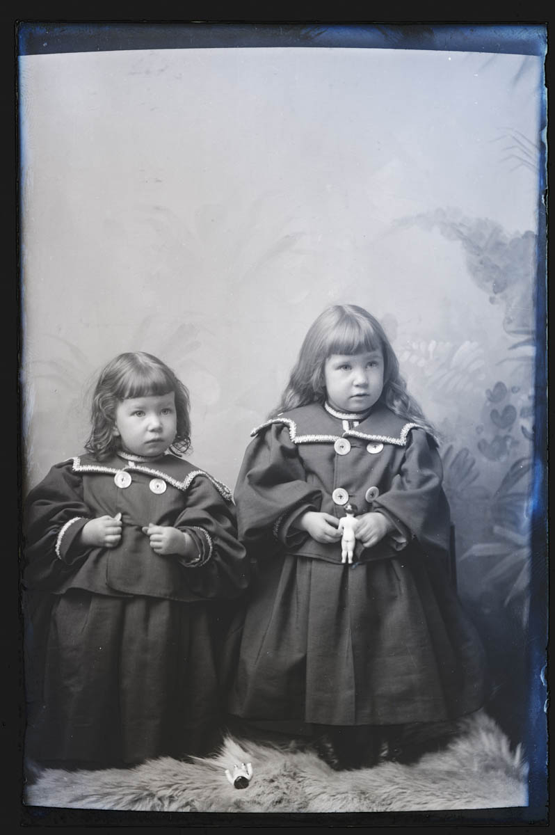 - Studio portrait of two little girls in matching dresses. No label on plate. Found in Box M. Because of our scanning procedure, this image is most likely flipped horizontally.