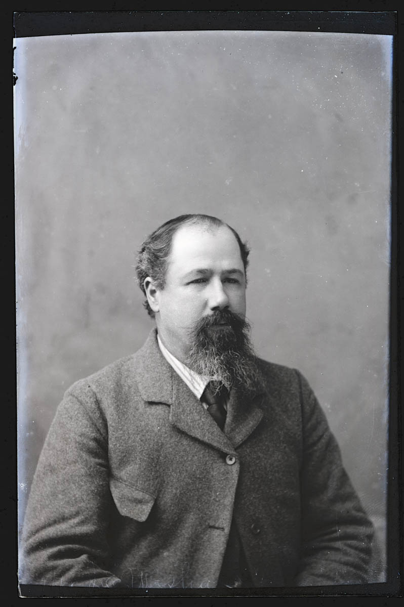 - Studio portrait of a man. Handwritten label on plate says "J. E. Wishard" Found in Box M. Because of our scanning procedure, this image is most likely flipped horizontally.