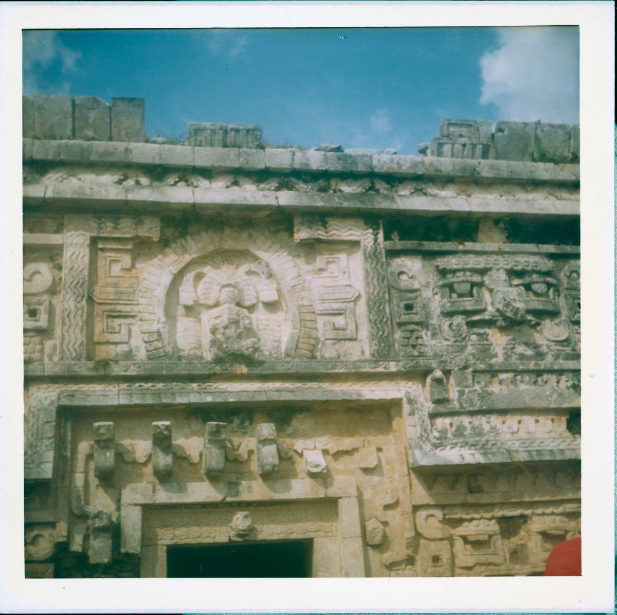 - Snapshot of a frieze on a large stone structure. Handwritten label on back says "Governors Palace, Chichen Itza, Yuc., Mexico"