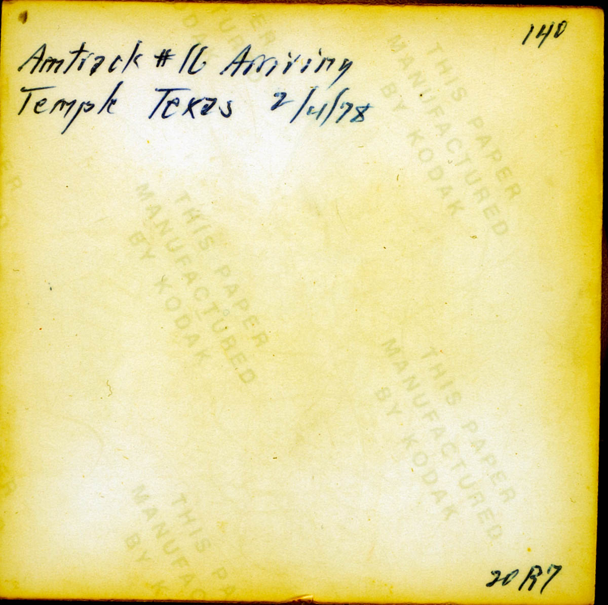 - Snapshot of a man waiting for a train. Handwritten label on back says "Amtrack #16 Arriving Temple Texas 2/4/78"