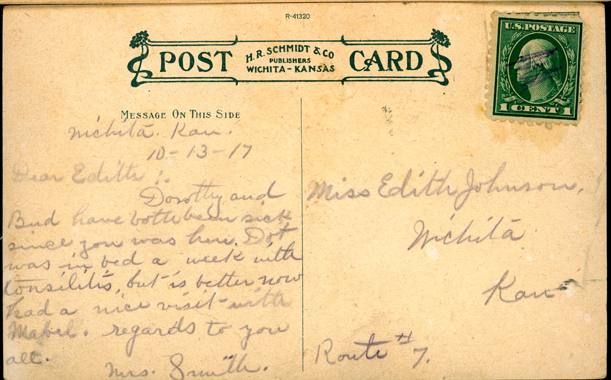 Handwritten note on back says "Wichita, Kan. 10-13-17 Dear Edith: Dorothy and I Bud have both been sick since you was here. Dot was in bed a week with tonsilitis, but is better now. Had a nice visit with Mabel. Regards to you all. Mrs. Smith Miss Edith Johnson, Wichita, Kan Route #7" - Date
