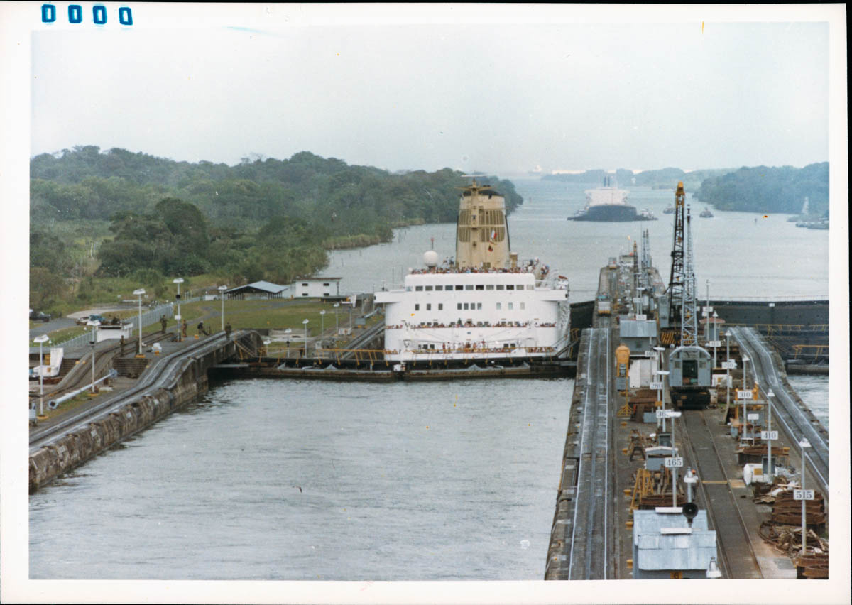 - Snapshot of a cruise ship going through a lock on the Panama Canal.
