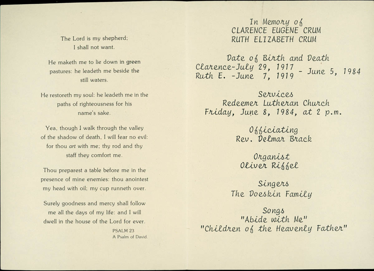 - Memorial Service Program for Clarence and Ruth Crum