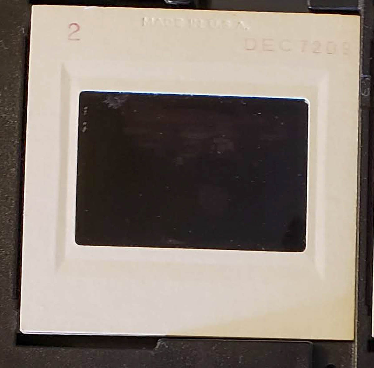 - Snapshot of three women and two men standing by a dinner table. Developer stamp on slide frame says "Dec 72"