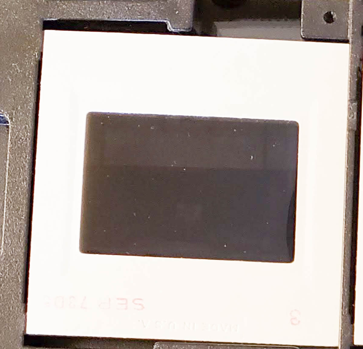 - Snapshot of three women and a man standing in front of a building with a shrine symbol. Developer stamp on slide frame says "Sep 73"