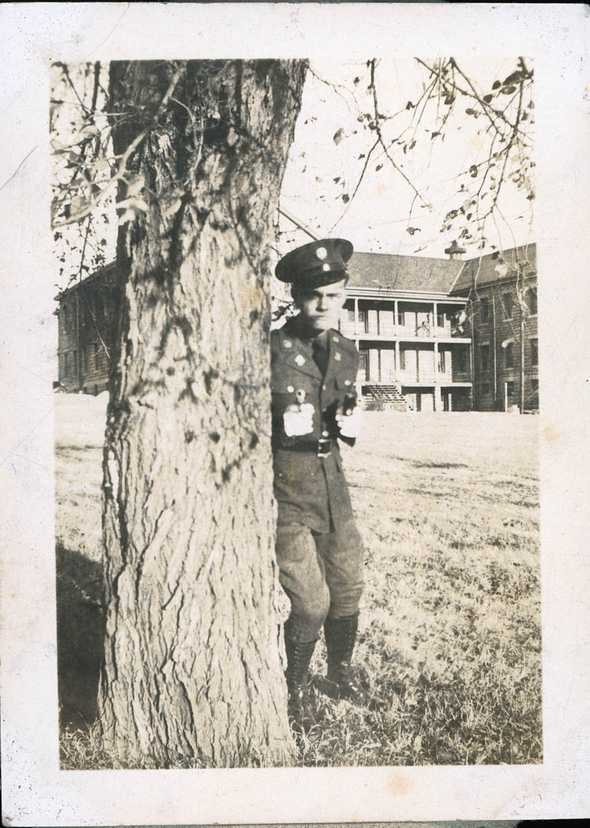 - Snapshot of a young man in military uniform posing by a tree with two pistols. This is an item in a scrapbook compiled by Mr and Mrs John D Rensink.