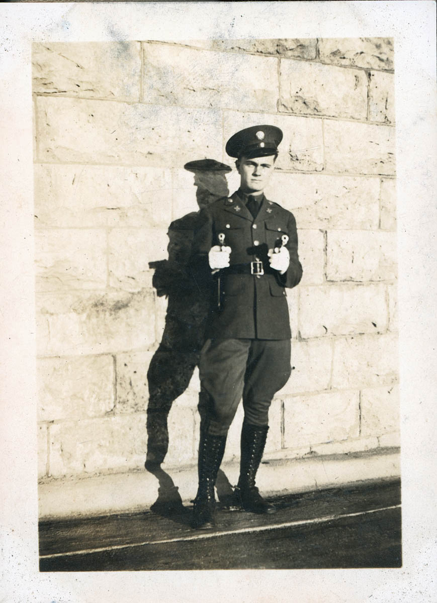 - Snapshot of a young man in military uniform. This is an item in a scrapbook compiled by Mr and Mrs John D Rensink on a page labeled "Fort Riley 84th F. A. Btry 'C' 1938"
