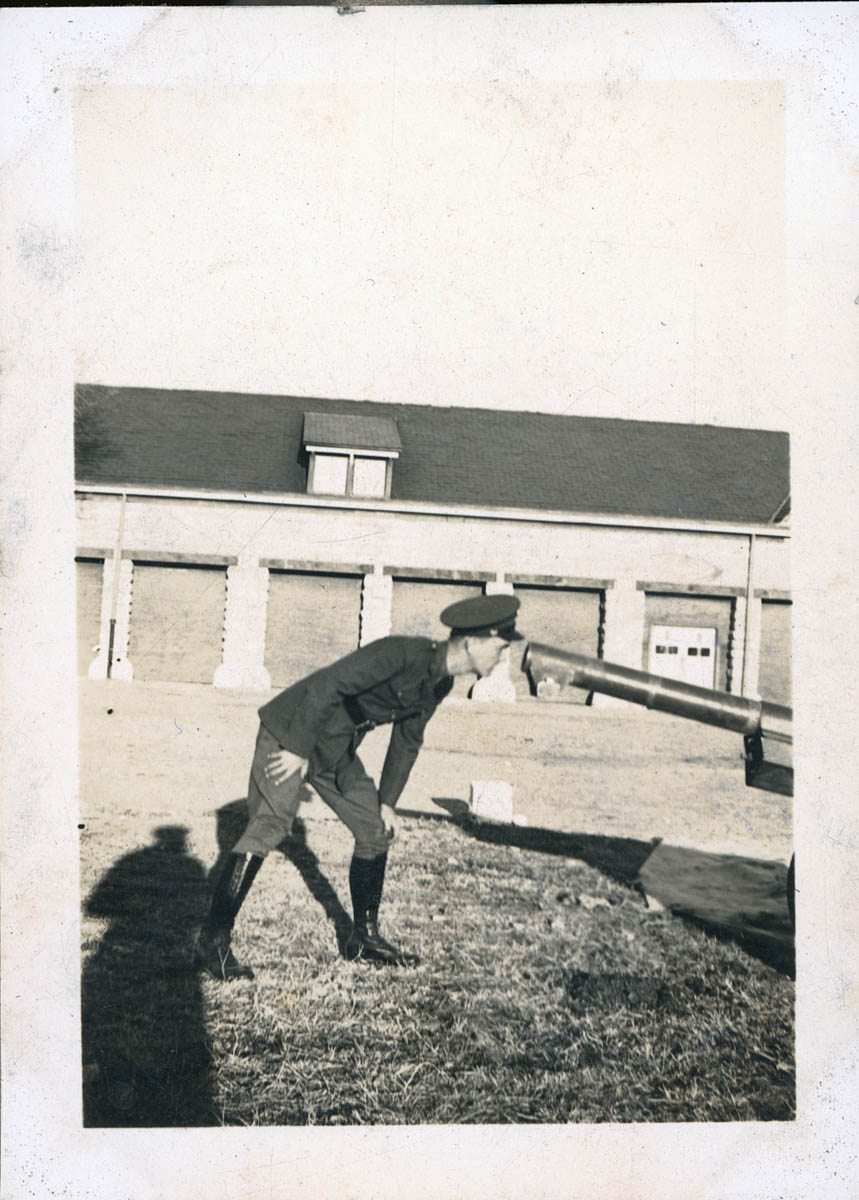 - Snapshot of a young man in military uniform looking in the barrel of a cannon. This is an item in a scrapbook compiled by Mr and Mrs John D Rensink on a page labeled "Fort Riley 84th F. A. Btry 'C' 1938"