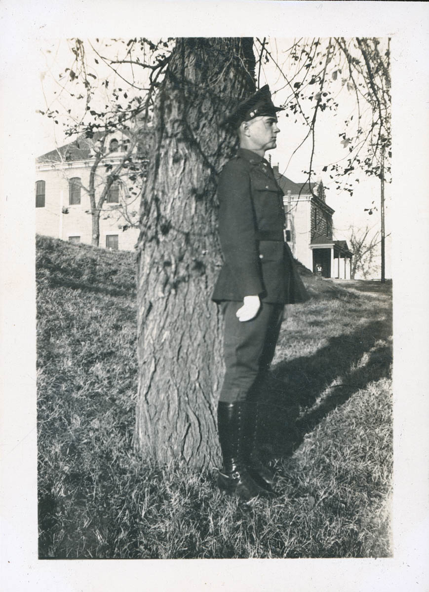 - Snapshot of a young man in military uniform posing by a tree. This is an item in a scrapbook compiled by Mr and Mrs John D Rensink on a page labeled "Ft Riley Ks 1938"