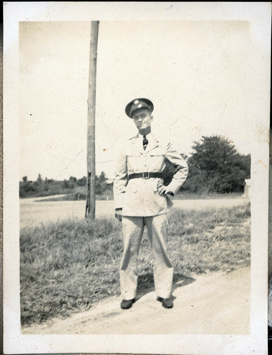 - Snapshot of a young man in military uniform. This is an item in a scrapbook compiled by Mr and Mrs John D Rensink on a page labeled "Ft Riley Ks 1938"