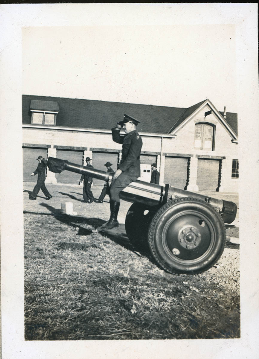 - Snapshot of a young man in military uniform posing on a large canon. This is an item in a scrapbook compiled by Mr and Mrs John D Rensink on a page labeled "Ft Riley Ks 1938"