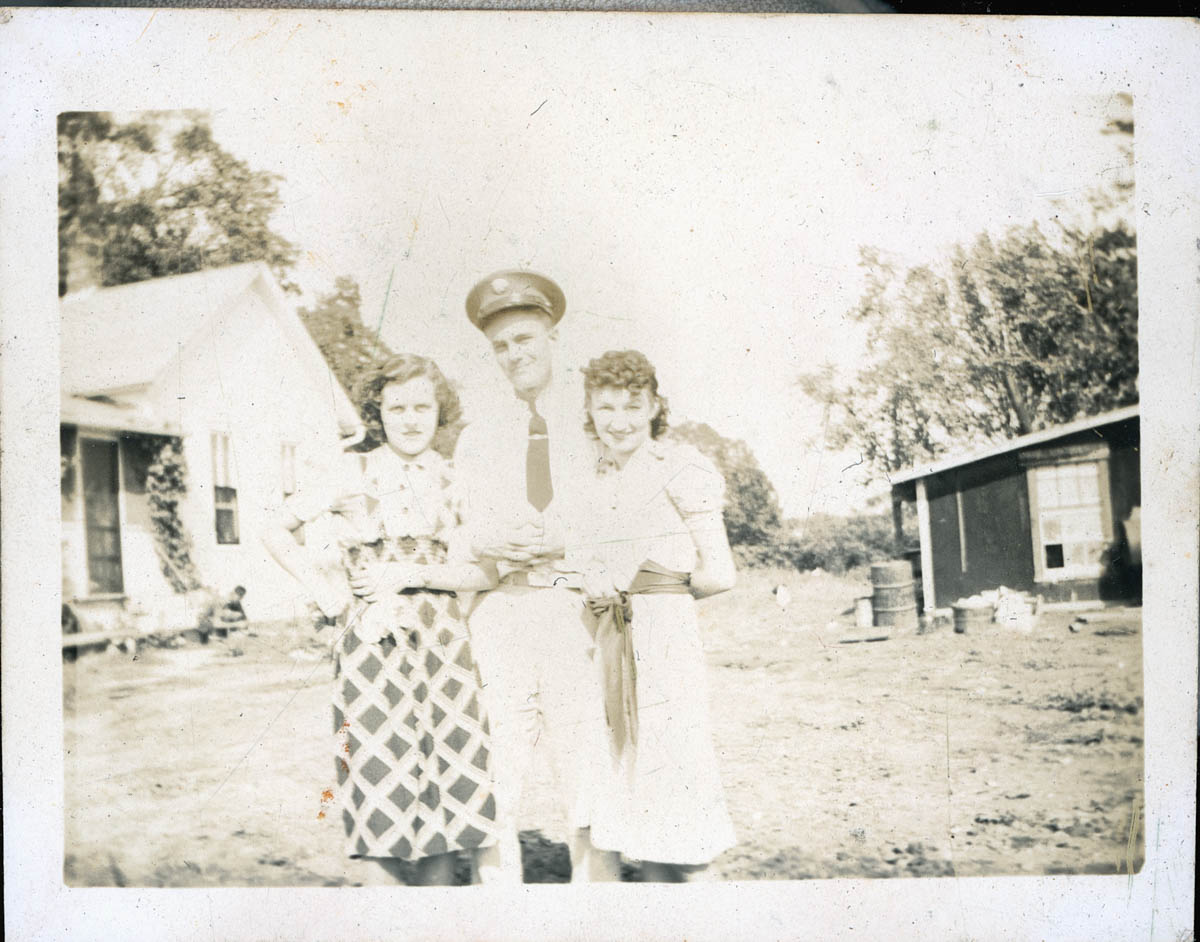 - Snapshot of a man in military uniform posing with two women. This is an item in a scrapbook compiled by Mr and Mrs John D Rensink on a page labeled "Emporia Ks. July 1938"