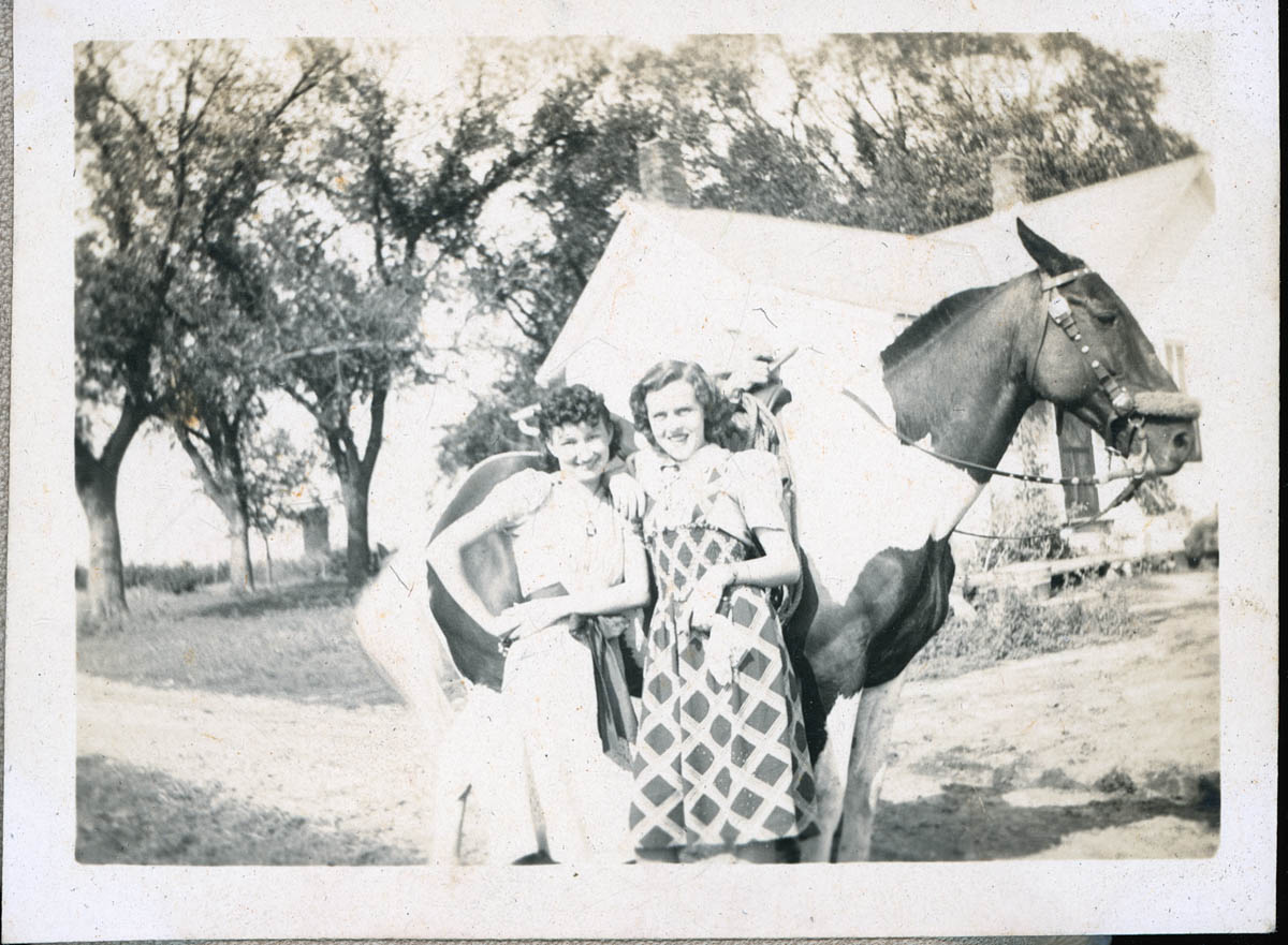 - Snapshot of two women posing with a horse. This is an item in a scrapbook compiled by Mr and Mrs John D Rensink on a page labeled "Emporia Ks. July 1938"