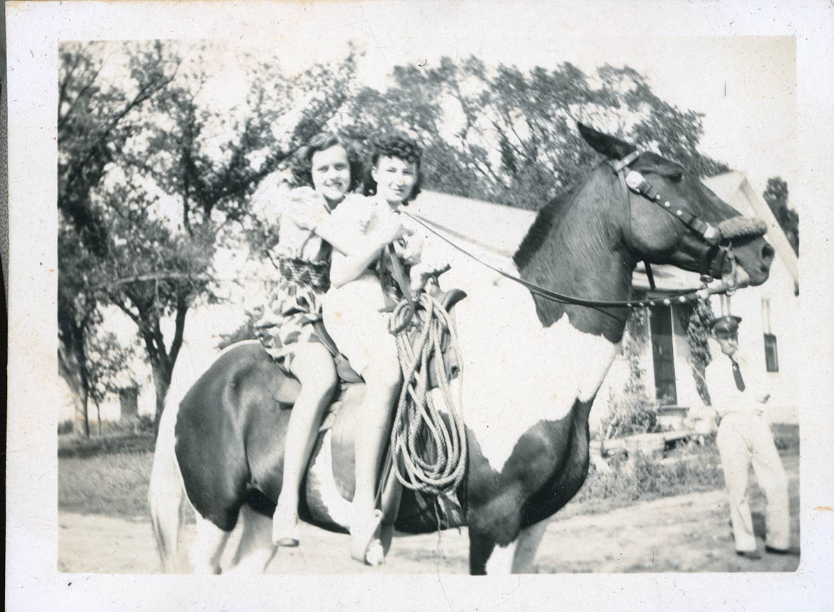 - Snapshot of two women posing on a horse. This is an item in a scrapbook compiled by Mr and Mrs John D Rensink on a page labeled "Emporia Ks. July 1938"