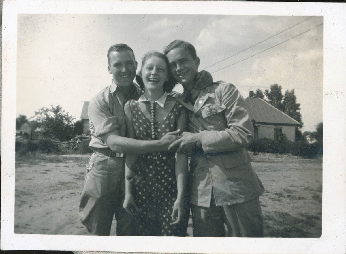 - Snapshot of two men, one in military uniform, posing with a woman. This is an item in a scrapbook compiled by Mr and Mrs John D Rensink on a page labeled "Emporia Ks. July 1938"