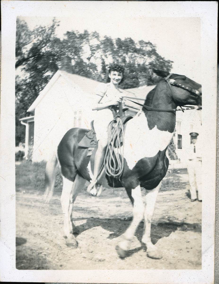 - Snapshot of a woman on a horse. This is an item in a scrapbook compiled by Mr and Mrs John D Rensink on a page labeled "Emporia Ks. July 1938"