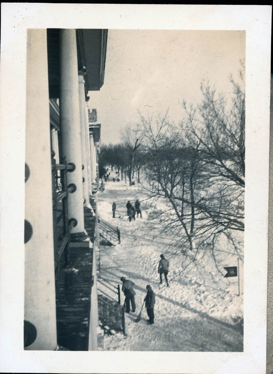 - Snapshot of men sweeping a sidewalk. This is an item in a scrapbook compiled by Mr and Mrs John D Rensink on a page labeled "1938 Ft Riley Ks."