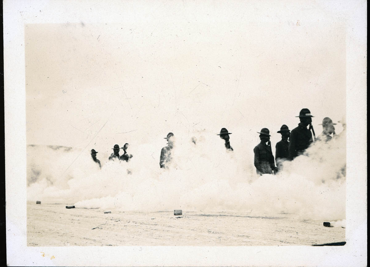 - Snapshot of men wearing gas masks standing in a cloud of smoke. This is an item in a scrapbook compiled by Mr and Mrs John D Rensink.