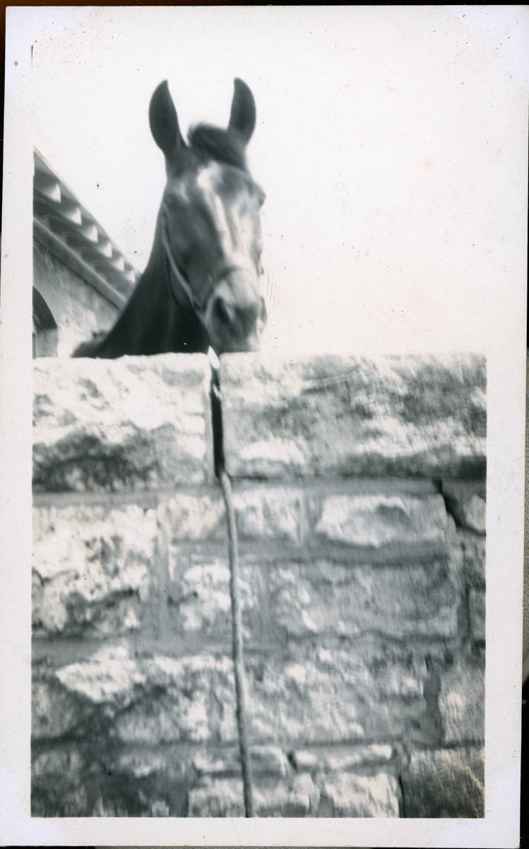 - Snapshot of a horse looking over a stone wall. This is an item in a scrapbook compiled by Mr and Mrs John D Rensink.