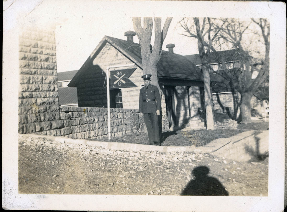 - Snapshot of a man in military uniform standing by a wooden flag for the 84th Field Artillary Battery C. This is an item in a scrapbook compiled by Mr and Mrs John D Rensink.